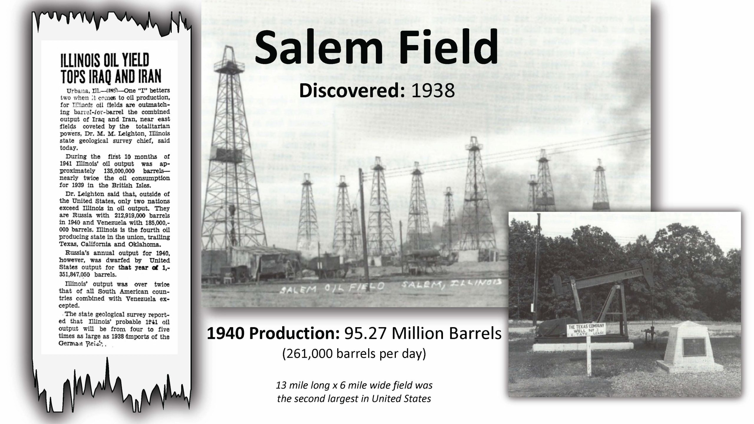 The discovery of the Salem oilfield and several other major Illinois Basin discoveries in the late 1930s helped literally fuel the Allied Forces’ victory over the Axis Powers in World War II in the 1940s.